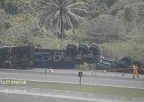 Carreta com líquido tóxico tomba e interdita BR-101, em Casimiro